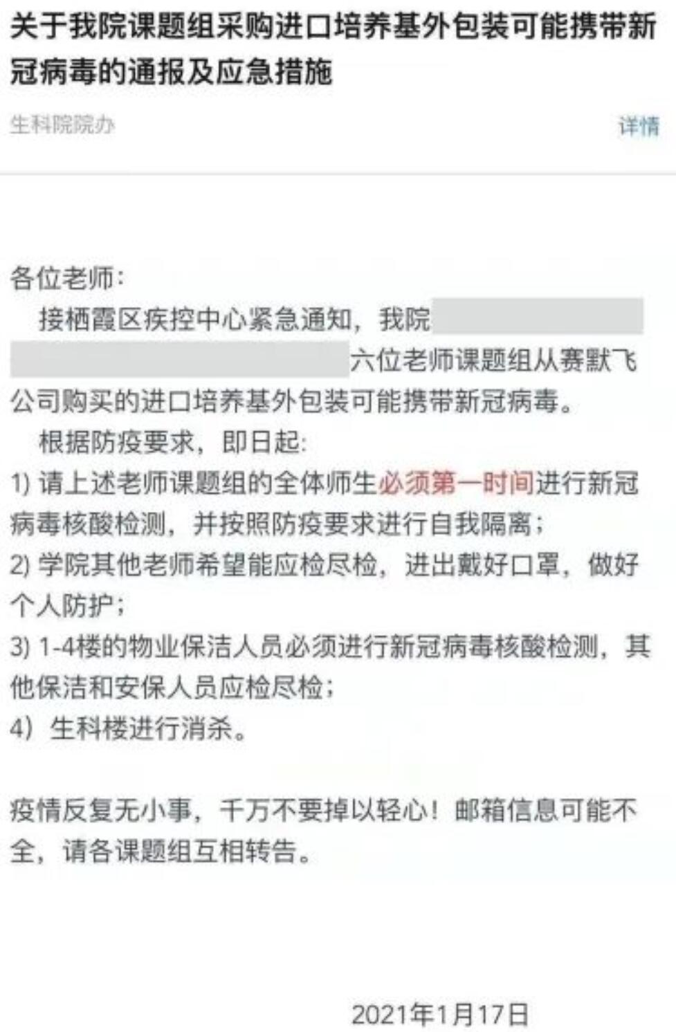 南京一高校緊急通知,采購的進口培養基可能攜帶新冠病毒