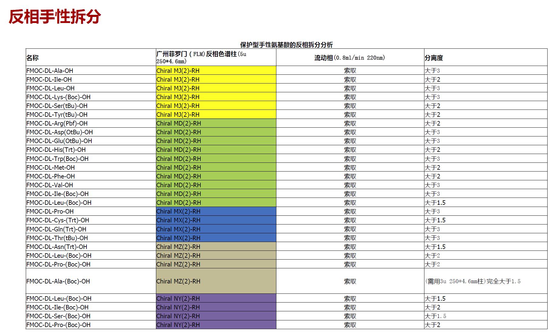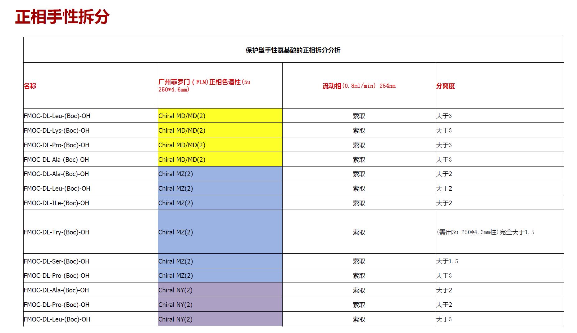 保護(hù)型的各類氨基酸,全部可以在某種多糖型手性柱中實(shí)現(xiàn)手性拆分。推薦的一套