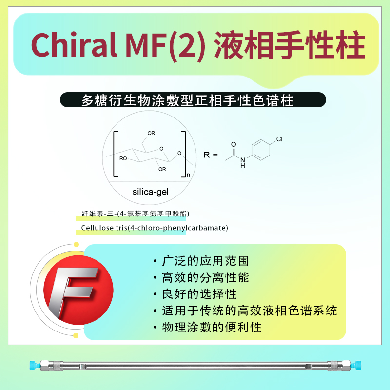 * **固定相**:纖維素-三-(4-氯苯基氨基甲酸酯)(Cellulose tris(4-chloro-phenylcarbamate)),這種固定相使得Chiral MF(2)具有優秀的手性分離能力。