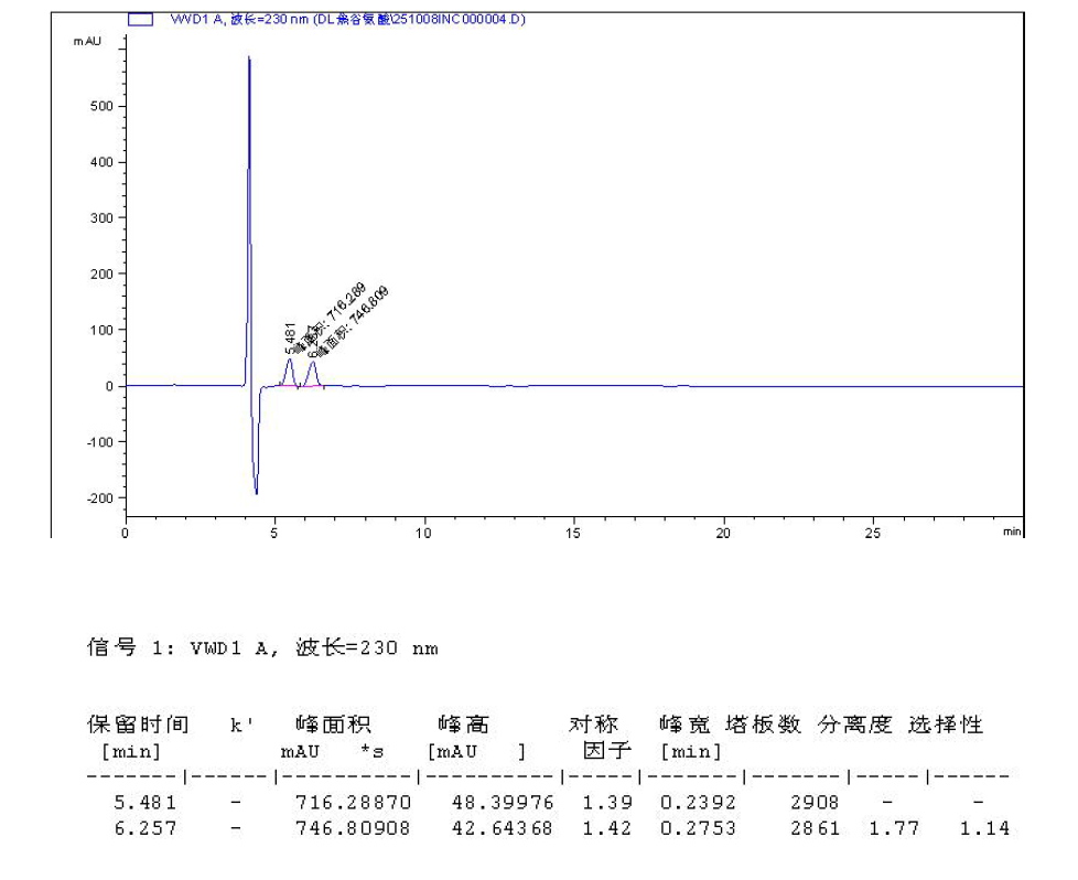 App ID: FLM-B250021 DL-焦谷氨酸的手性分析 方法:自定 色譜柱:Chiral INC 5μm 250×4.6 mm 貨號:FMG-JY5-I03 流速:0.6 mL/min 檢測:UV230nm 樣品濃度:1 mg/mL 進(jìn)樣量:2 μ 流動(dòng)相:咨詢 色譜圖: