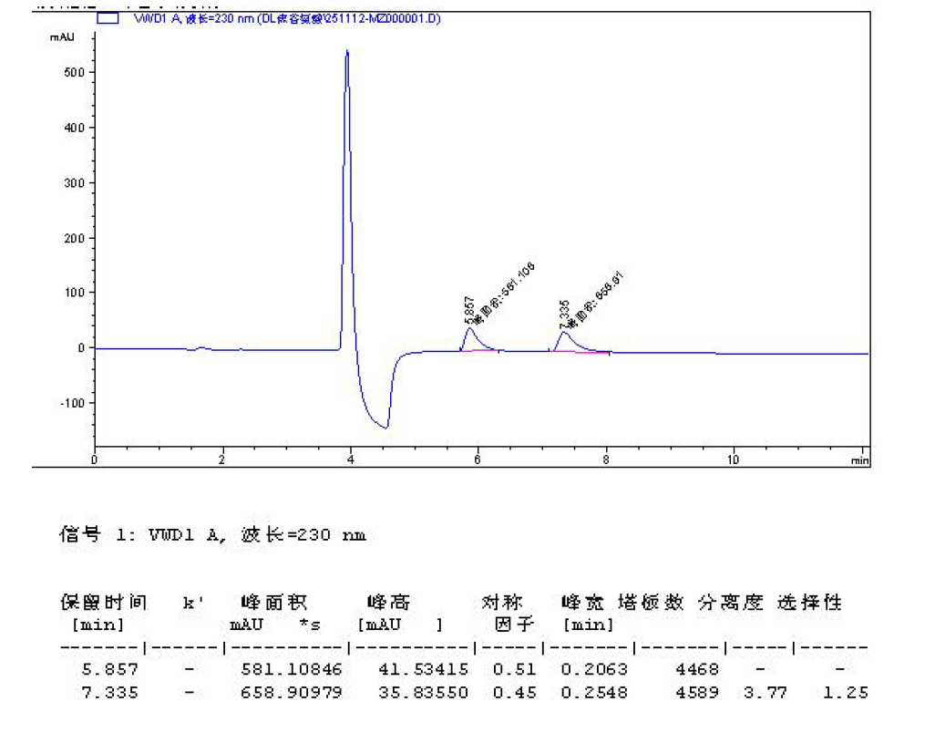 色譜柱:Chiral MZ(2) 5μm 250×4.6 mm 貨號:FMG-AC5-B02-NFC 流速:0.8mL/min 檢測:UV230nm 樣品濃度:1 mg/mL 進(jìn)樣量:2 μ 流動(dòng)相:咨詢